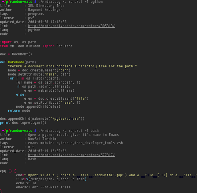 I wrote a script rndeat.py, using python-recipes for accessing ActiveState Code and Pygments (optional) for syntax highlighting, to randomly pick one recipe: